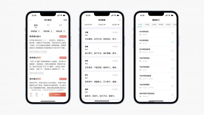 对于学生党使用来说,APP中还提供有作文素材、诗词歌赋、速算题和儿童常用素材等内容资源,可以直接将这些在线资源打印下来供孩子学习参考。内容资源涵盖的科目和年级比较全面,适合不同年龄段的学生参考学习。