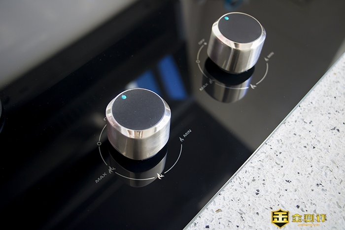 燃气灶面板中间下方位置有两个控制旋钮,灶具采用的是下压旋转式的打火,能够有效的防止熊孩子意外触碰开启,保障安全。