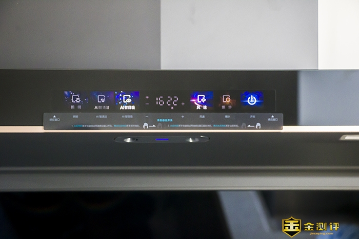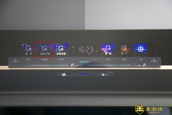 彩屏面板上带有照明开关,AI智清洁开关,AI智目吸开关,强度+爆炒按钮,开关按钮。中间的面板有时间显示,方便掌握烹饪时间。一键爆炒可瞬间开启23m³/min的超大吸力,炒辣椒再也不是开放式厨房的噩梦。