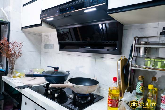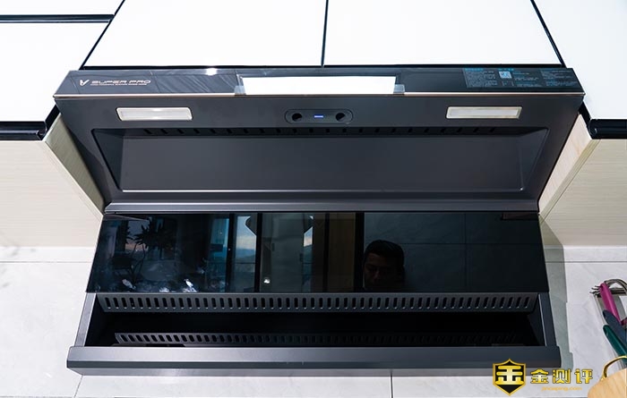 另外还可以看到两个LED灯在炒菜的时候自动亮起。同时,侧面油烟重灾区域为黑金玻璃材质的面板,不仅更好看,更高档。而且在清洁卫生时将非常的方便容易。