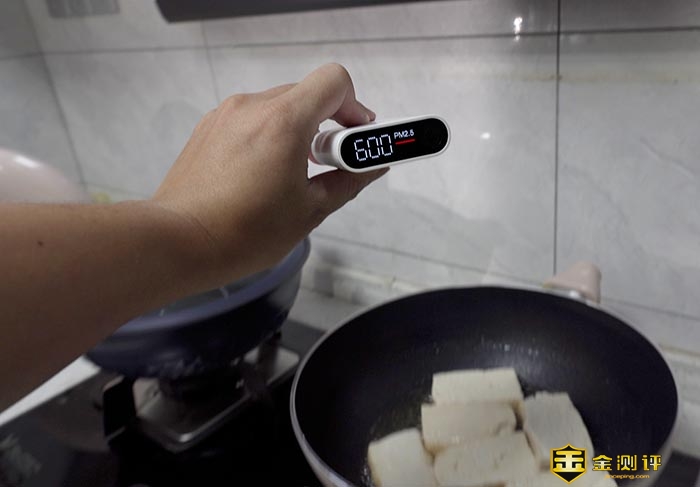 在我煎豆腐的正上方,可以看到PM2.5测出来的值已经超过600爆表。如果没有烟机,这些PM2.5超标的油烟将会大量进入我们的肺部造成损害。