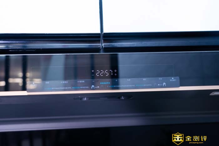 在正面的操作面板上,除了有一个LCD时钟显示外,只看到有一张功能介绍贴纸。在新手第一次使用的时候还真得好好看一下这个功能介绍,从左往右分别是感应窗口,照明开关,AI智清洁,AI智目吸,风速,爆炒,开关,感应窗口。如果从左往右经过这2个感应窗口则可以开机。再从左往右划下可以调风力。而从右往左快速经过两个感应窗口则可以延时关机,再从右往左则可以立即关机。