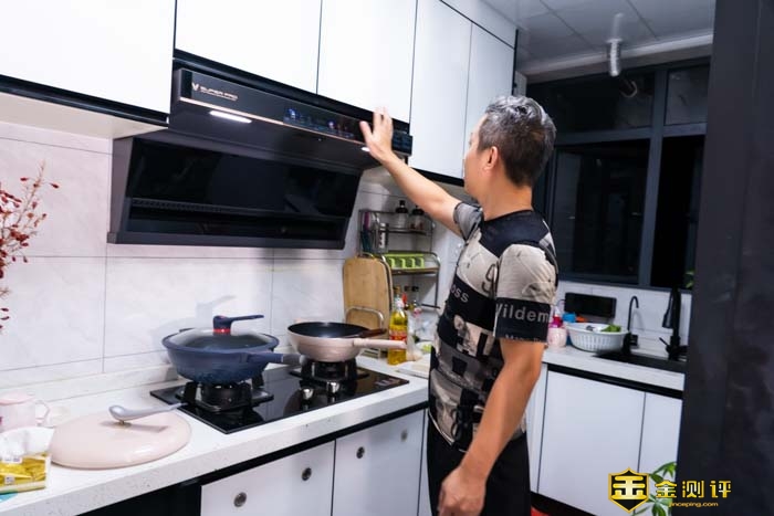 虽然我在煎豆腐,但整个狭小的厨房,在旁边都闻不到一点油烟味。这不仅有它的每分钟22立方米的爆炒档风量,而且2枚红外自动智能识别预判油烟,内置了智能AI芯片,通过油烟曲线和多维AI算法,分析后自动调节风量的大小 ,全程无需要人工干预。