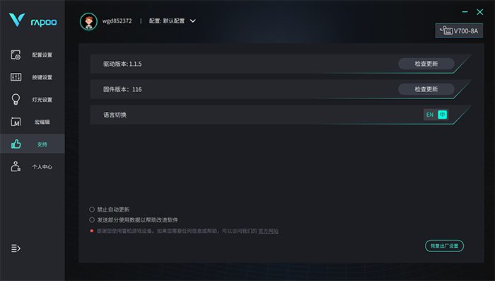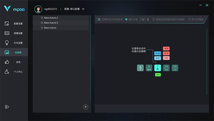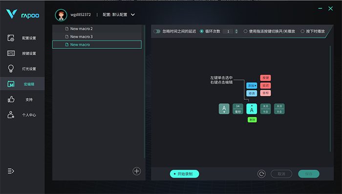 可以保存多个宏,针对不同的任务进行个性化设置,也不用担心换电脑找不到保存的宏方案,雷柏的驱动软件支持设置云存储,只需要登陆自己的雷柏账号即可。