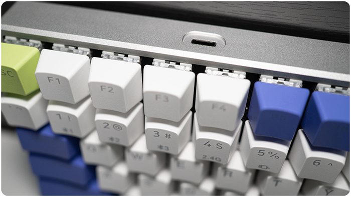 在机身背部有一个可供充电/有线连接的C口,不过都可以通过无线配对4个设备了,妥妥够用了,有线基本就是拿来充电了的。用久了FL980的隐藏式C口设计,雷柏V700-8A的C口简直不要太方便。说到充电,其实也不用经常充,因为这款键盘内置了一块4000mAh的锂电池,充一次电用个几天没问题。
