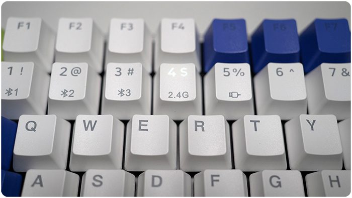从键帽上的标记可以看出,这款键盘可以连接多个设备(实际连接方式包括Bluetooth 5.0,3.0,USB接收器、有线),数字区的1-5分别对应了三个蓝牙连接、一个2.4GHz连接和一个有线连接,一共可以配对5个设备,通过Fn与对应的按键就能实现双键切换设备。