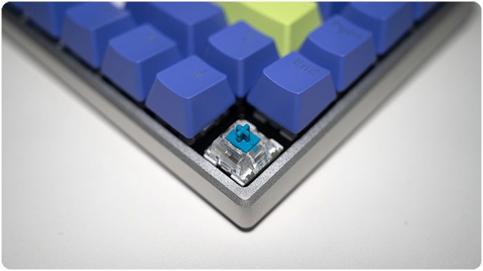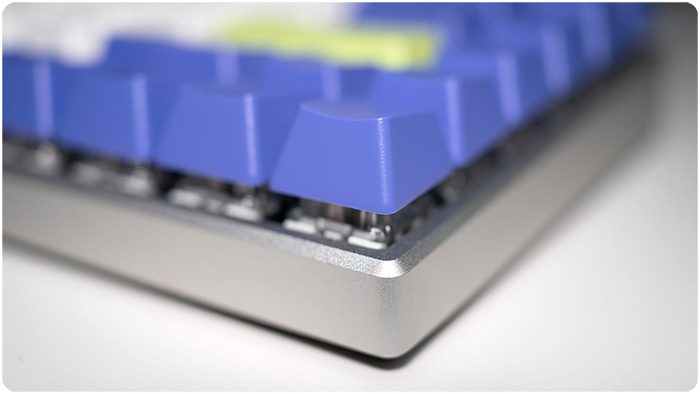 这款键盘采用的是PBT双色注塑键帽,键帽内侧“第二色”是透明设计。键帽是磨砂手感,触感比较顺滑。