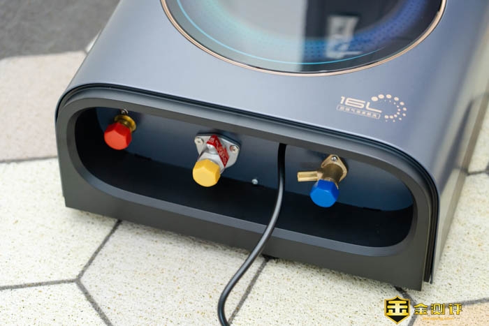 再来看看底部,采用双色拼接设计,黑色的一圈不仅起到一个接头的保护作用。同时,还能起到美观作用,让各种进出水接头和燃气接头可以隐藏起来,看起来更整洁,更美观。