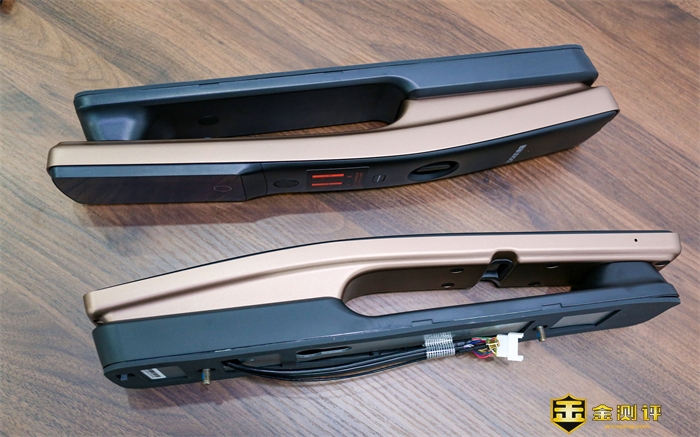 侧面看,弧线设计展现的更清晰,排线也整齐有序,很有质感,给人精工细作的感觉。智能锁摸起来很柔软,握感舒适。
