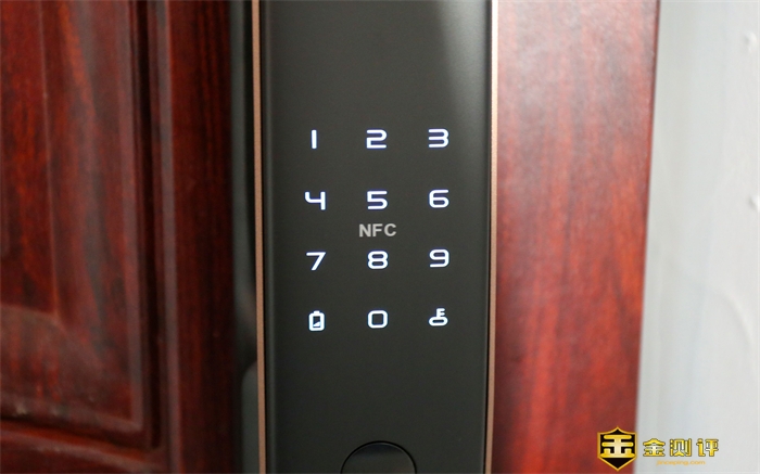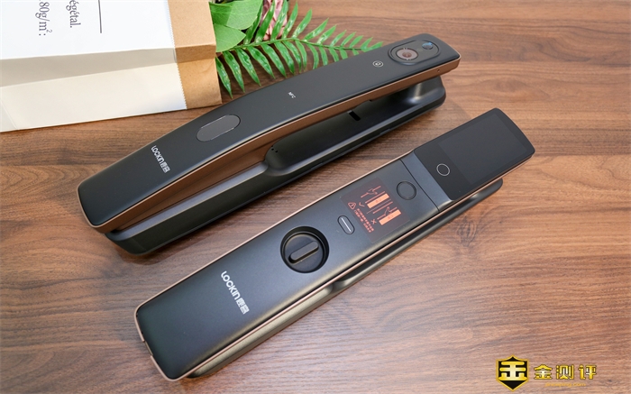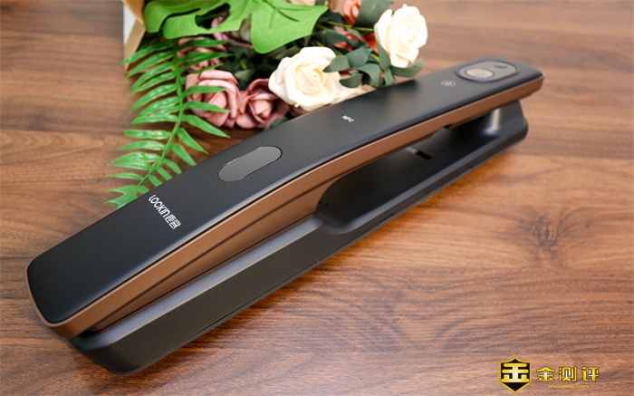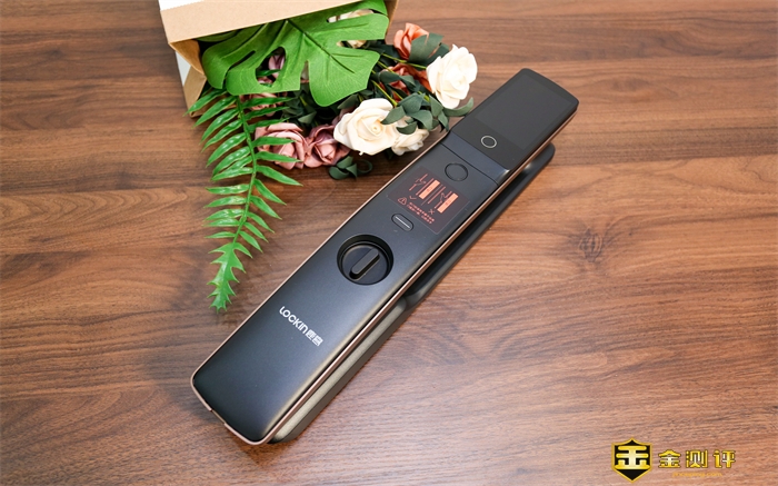 鹿客智能锁S50MPro黑色的面板有琥珀金的做点缀,整个智能锁颇有商务风,其材质是铝合金+IML<琥珀金、星空灰>,铝合金一体面板,一体成型,看着就很高端。