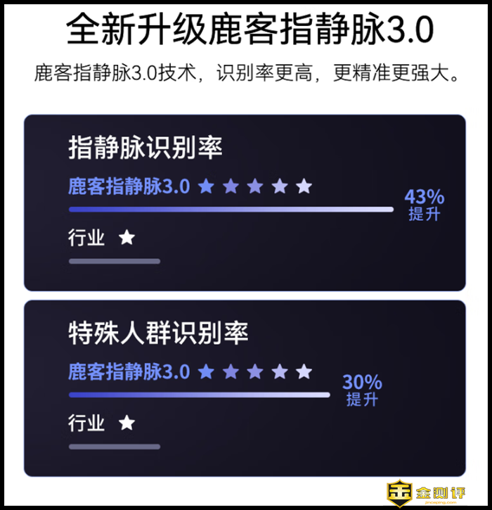 据官方介绍鹿客指静脉3.0技术,指静脉识别率提升了43%。指静脉识别技术具有识别稳定性高、准确率高、难以窃取复制、安全性高等优势。