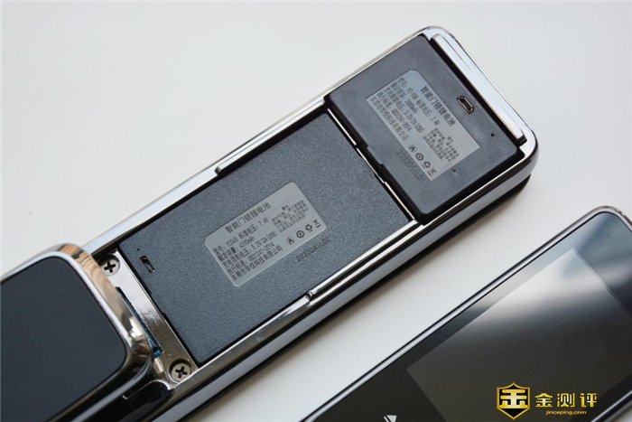 当然,至于这块触控显示屏,它还具备可拆卸功能,在其底端是电池槽,这里布局了两块可充电锂电池,分别是2000mA和4200mAh,两款电池分别给猫眼屏和锁控供电。从实际使用情况来看,两块电池续航时长可达3+6个月,避免了频繁充电的烦恼。