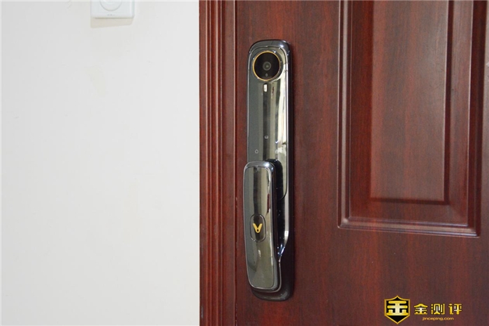 细看外面板的细节,顶部的圆形结构为猫眼部分,它支持850nm的红外夜视以及140°的广角镜头,可以清晰、大范围的看到门外情况,这对提升居家安全无疑有很大的好处。