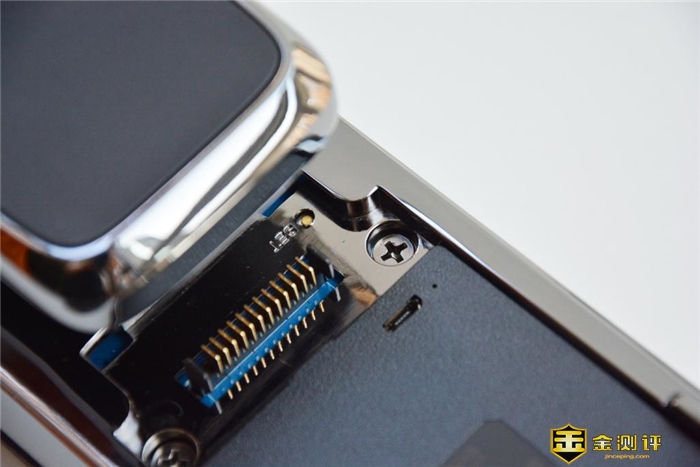 说到这里,不少小伙伴心中可能会出现这样一个疑问,这块可拆卸的显示屏到底是如何与设备连接的?往上看细节,在电池槽的下端有一排金手指信号接口,靠着这一设计,实现了显示屏的可拆卸功能。