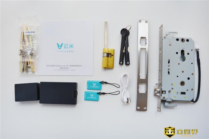 产品配件,除了云米全自动指静脉锁eyeLink 2S的内外面板外,还包括安装开孔图、锁体、电池、锁芯、IC卡、钥匙、充电线、说明书以及安装包等配件。