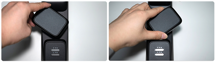 云米Super 2智能门锁在外锁下方印有logo的圆盖其实内藏了一个物理开锁的锁孔和Type-c的应急供电接口,这个圆盖是通过磁吸的方式进行封堵,为了防止掉落丢失,圆盖是用一根胶条与锁体连在一起的。锁孔和Type-c的接口都是为了避免门锁没电时的窘况。
