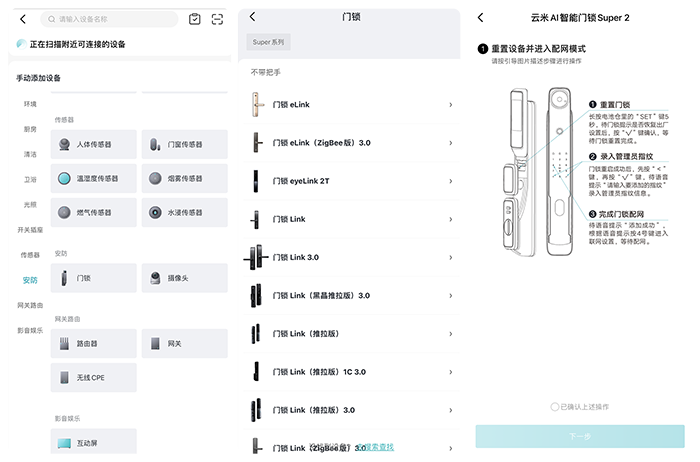 首次绑定云米Super 2智能门锁的时候需要手动搜索“门锁Super 2”,也可以手动选择,云米Super 2智能门锁在安防类目下,选择以后会弹出操作方式。