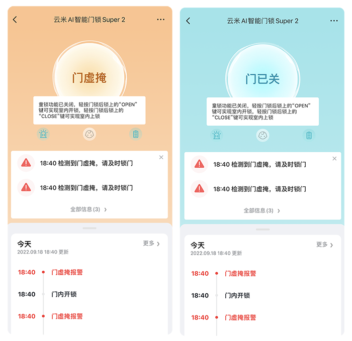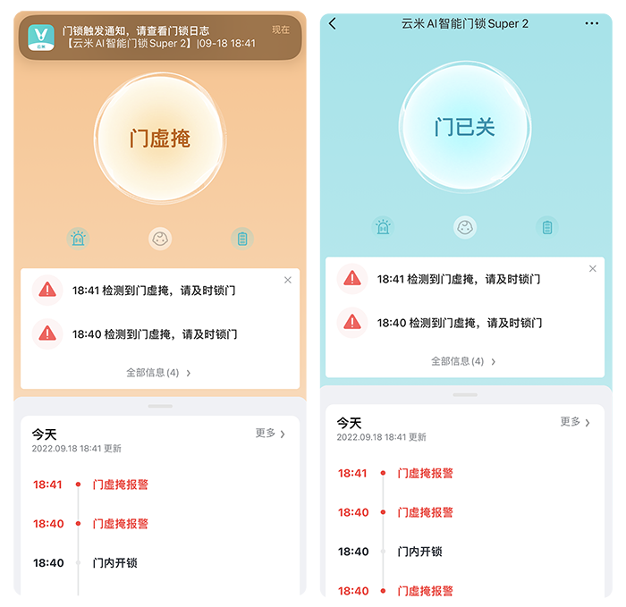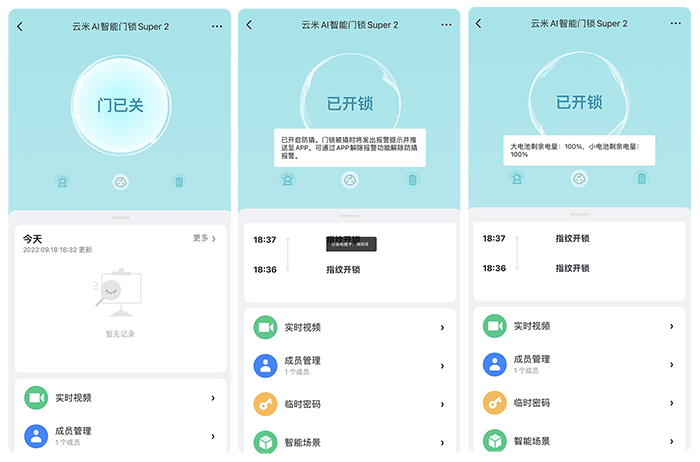 在云米App中进入云米Super 2智能门锁的管理界面,最先看到的就是门锁的状态,共有六种:门已关、已开锁、门未关、门虚掩、已上锁、已反锁,其中门未关状态持续30秒会通过扬声器进行提醒并通过云米App在手机端进行信息推送,门虚掩状态持续3秒就会有同样的告警语音及报警信息上报。