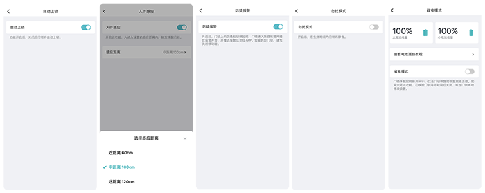针对云米Super 2智能门锁,提供了高级设置选项,可以根据自己的需求进行不同的设置。比如人体感应距离可以根据自己家门口的情况进行不同感应距离的设置;关门后自动上锁而不是需要手动按一下内锁上的关锁键;电池状态查看以及省电模式的开启。