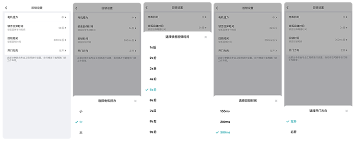 针对锁舌的“运动情况”也可以详细设置,比如内锁上负责开关锁的物理开关,可以通过云米App设置开关锁的方向,就连电机扭力都可以进行自定义。该功能需要注意一下,需要由专业人员设置,不能随便修改,否则可能导致门锁异常。