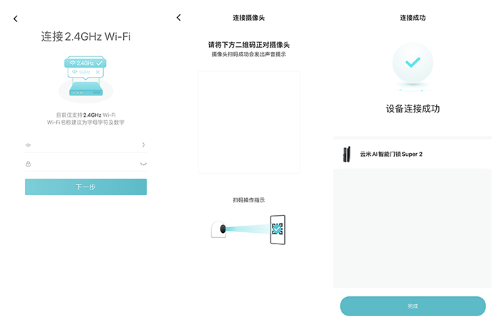 根据语音提醒一步一步操作即可。这里需要注意下的是,云米Super 2智能门锁只支持连接2.4Ghz wifi,且WiFi名称中不能有汉字和特殊字符。为了隐私我把中图的二维码清除了,实际在方框中间是一张二维码图片。