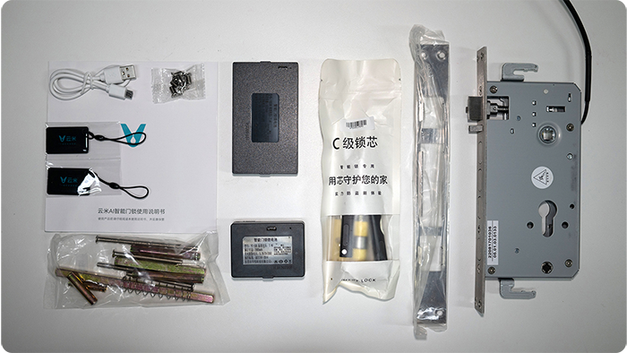 除了内外锁面板外,还有很多丰富的配件,值得一提的是,这次云米Super 2不只是支持门卡开锁功能,还附赠了2张门卡,除此之外,云米Super 2没有采用像其他锁一样的8节电池的解决方案,而是提供了一大一小两块可充电电池,还附赠了一根充电线。C级锁芯自不必说,肯定是标配了。