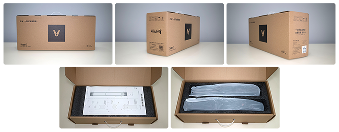 包装的正面印有品牌的logo,品牌的Slogen:一站式全屋智能。定位清晰明确。在包装的正面还印有产品的名称Super 2。包装的两侧分别印有产品的一些生产信息。
