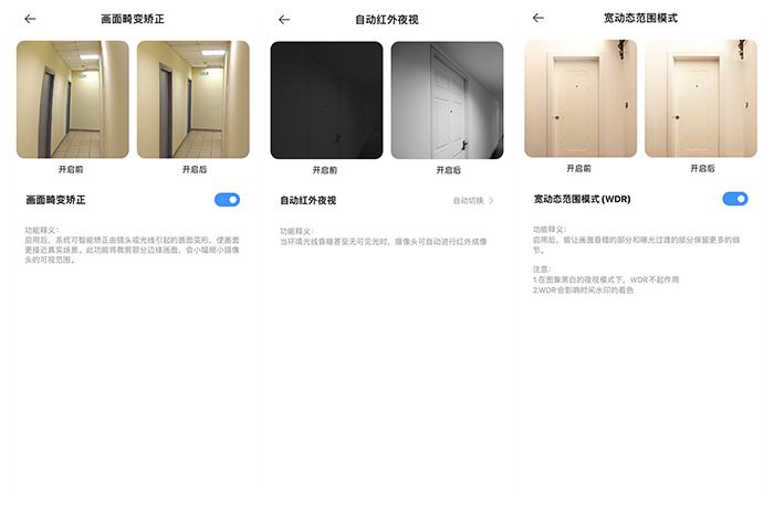作为一款猫眼,自然不能缺少一些画面校正功能,比如畸变校正,红外夜视以及宽动态范围模式,这和我正在使用的鹿客猫眼的功能基本一致。