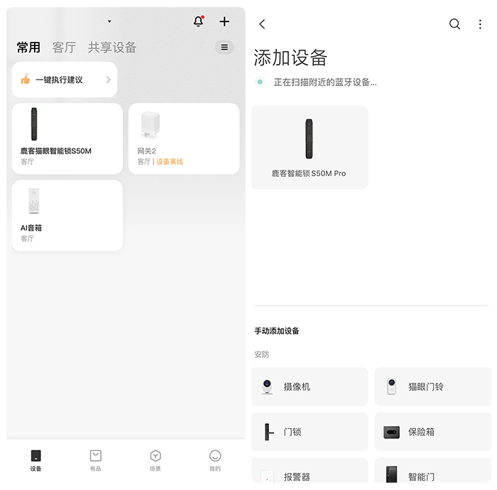 鹿客S50M Pro接入米家的流程也非常简单。如果家里已经有接入米家APP的相关设备,直接打开米家APP,点击右上角的“+”去发现设备,会在列表里直接显示这款智能锁,点击即可进入到配对状态。