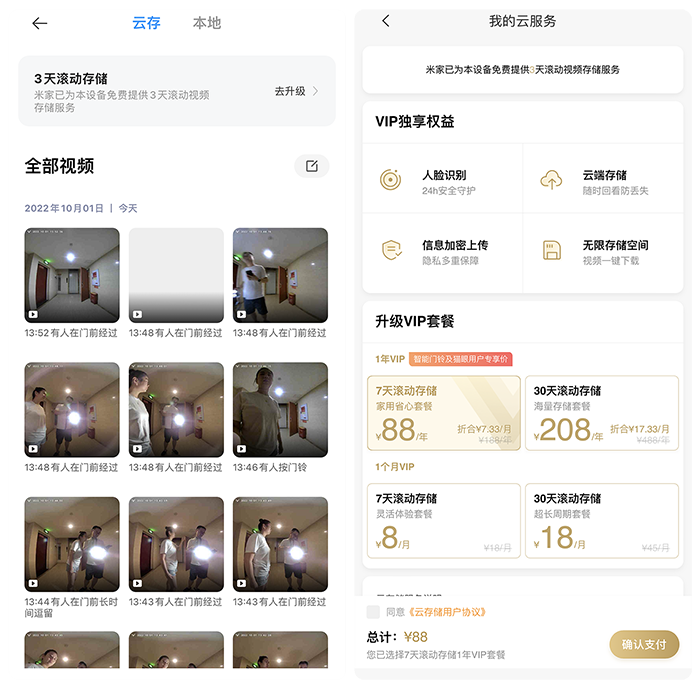 在视频存储方面,鹿客S50M Pro支持3天滚动存储,如果需要更久的存储服务,则需要单独购买。