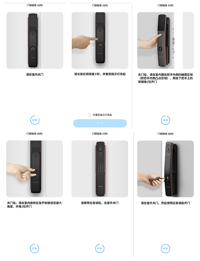 鹿客S50M Pro智能锁的设置逻辑设计的比较合理且新颖,首次安装配网成功后,还会进入到一个门锁验收的过程,一共有9个步骤,根据APP里的提示一步一步验证各项功能是否完好,这一步是在安装师傅安装完但是还未离开的状态下进行的,如果哪一步有问题没办法正常使用,师傅会现场修复。这样的设计有几个好处,比如师傅安装不认真,无法正常使用,但是在这个环节验收前师傅是会在现场等待的;智能锁小白或者是家中只有老年人在现场安装,对这些智能产品安装的好不好不太懂,这一个步骤也能够解决不懂的问题;最主要的是,这个验收步骤的增加能够让用户直接在安装现场确认门锁安装的状态,避免一些不必要的麻烦。