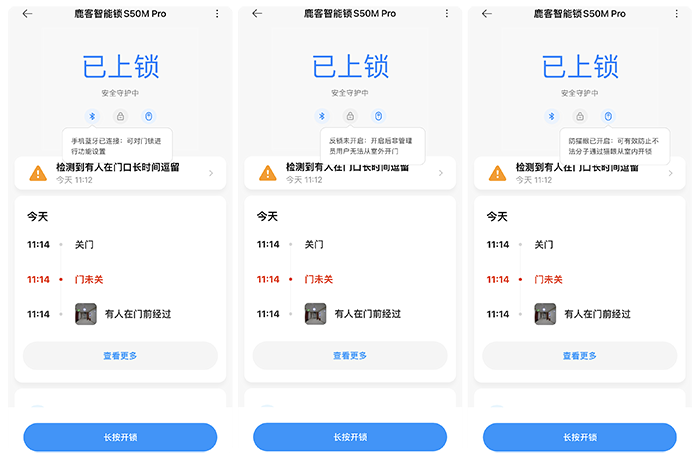 这里需要提到一个门未关的报警功能,可能很多智能锁都会有这个功能,但是有些细节方面鹿客S50M Pro这款指纹锁做的更加细致。除了可以根据自己日常的习惯进行设置报警时长,鹿客S50M Pro智能锁的优势在于门未关的警报是内外都在报警,而且声音不同。除了以防止着急出门随手一关门却未上锁的情况,还能够避免有些老年人耳背,在进门后没关上门的情形下报警是在室外而室内没有报警的情况。