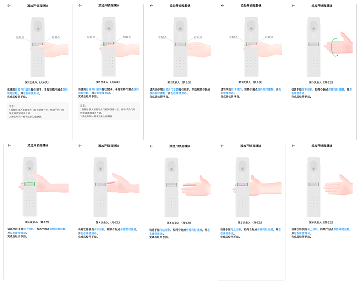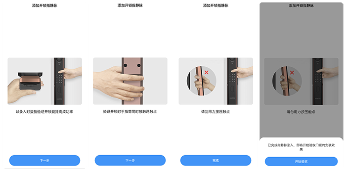 录入的过程一共有6步,按照提示一步一步往后操作即可,有一些使用技巧还是需要注意的。通过实际测试来说,使用方法正确基本是“百发百中”,而之前我用鹿客S50M的时候总是奇怪为什么解锁成功率不是百分之百,这次仔细研究了以后才发现,用习惯了指纹锁,会用手指用力的摁住指纹解锁区域,指静脉则不需要用力,轻触即可解决问题。