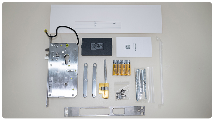 将锁芯与配件全部打开以后包含了很多内容,一张安装定位图、主锁体、供电锂电池、说明书、两把钥匙、C级锁芯、8节5号电池、安装螺丝、定位柱、锁舌孔等。