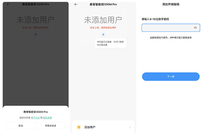 验收成功以后,就进入到了用户添加的对话框,首次添加的默认是户主,为了避免因为操作过程中会发生意外情况,鹿客S50M Pro会先让用户设置一个开锁密码,以防止指静脉录入失败又不小心把门关了,且物理钥匙放在了室内的情况。