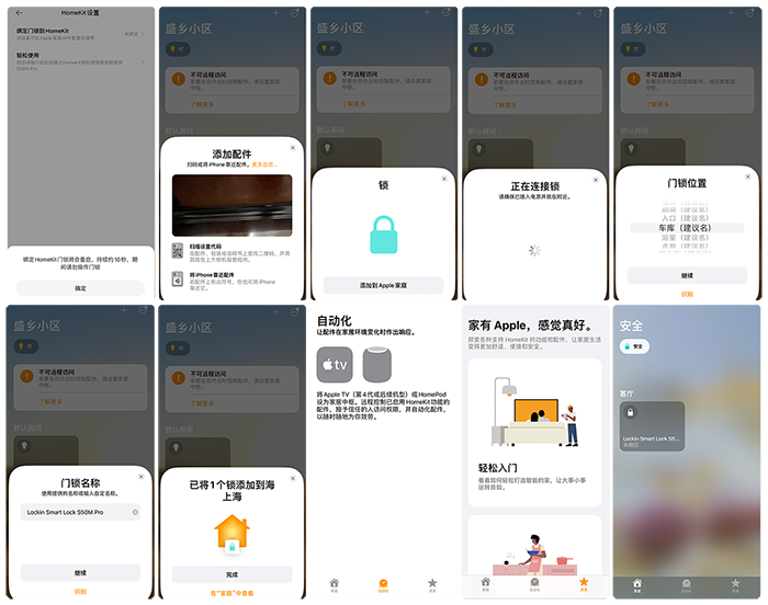 在米家APP中就有可选择的对话框。通过iPhone自带APP家庭,扫一下鹿客S50M Pro内锁电池盖下方的绑定二维码就可以进入到Homekit绑定的状态,可以在家庭APP中设置基于Homekit的智能联动功能。