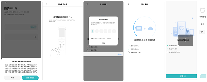 配对和其他米家智能设备没什么两样。相对来说,鹿客S50M Pro的设置逻辑更加清晰,在配对后先设置数字密码,设置好了以后可以让智能锁正常开关锁,然后才是输入密码连接wifi,鹿客S50M Pro智能锁支持的是2.4Ghz wifi网络。稍微等待一下就完成了配网。