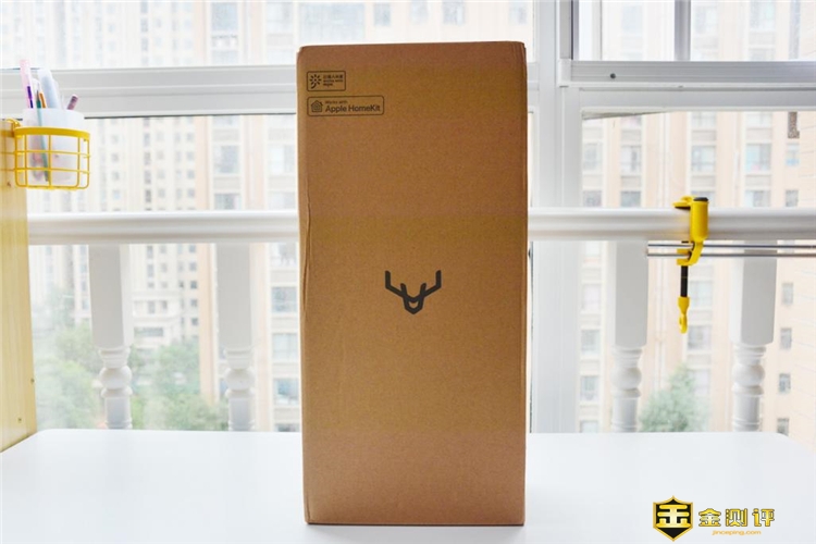 鹿客智能锁S50M Pro外包装是原色长方体纸盒,上面没有太多的图片和信息,只在包装盒正面中间有简单的“鹿客”品牌图标,左上角是苹果互联的标识,整个包装十分简约。