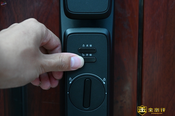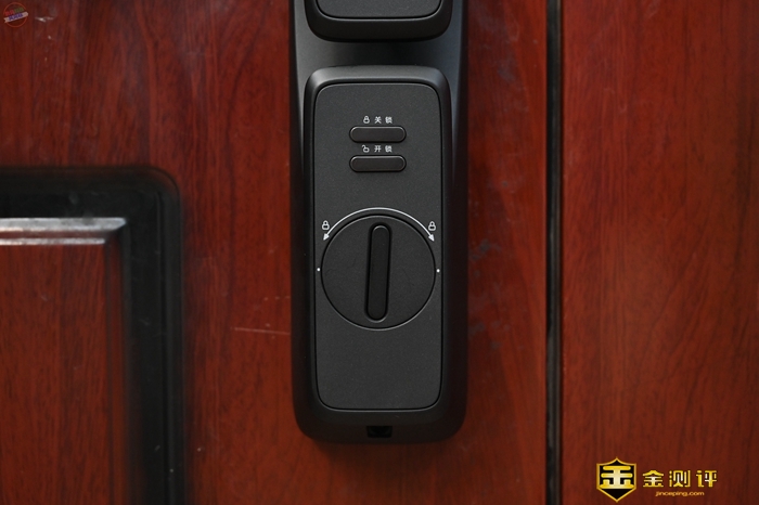 最下面的是反锁旋钮,开启时可以阻止外侧开门,起到安防作用。