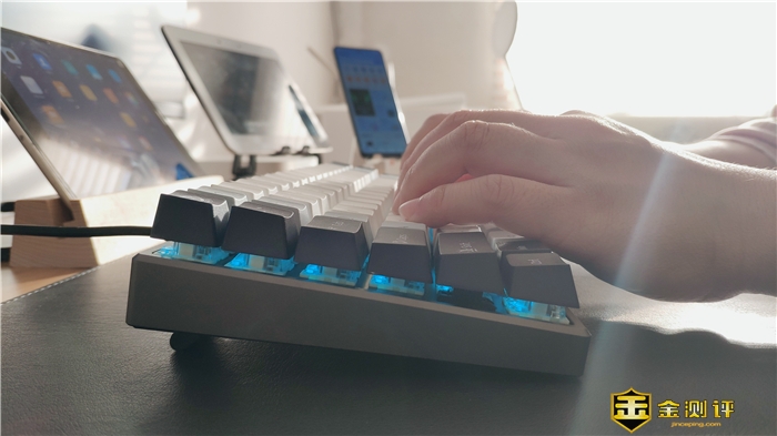 当初我也是有点顾虑,这么小的键盘,能不能打字时手指打架而且打字太快以至于键盘跟不上手速呢?上手才明白,键帽高度高出薄膜按键确实是有道理的,键程段落感确实很强,轻触下的反弹很是舒服,当你手指敲在键盘上时都会得到一种迅速、直接、硬朗、明确的反馈,上手这么久可以做到6键以上甚至有线连接模式下全84键任意键同时输入无冲突,反馈响应依然迅速,说实话,用“极其”毫不为过,在各项功能实现方面也同样表现出色。