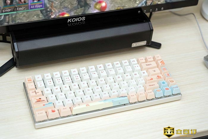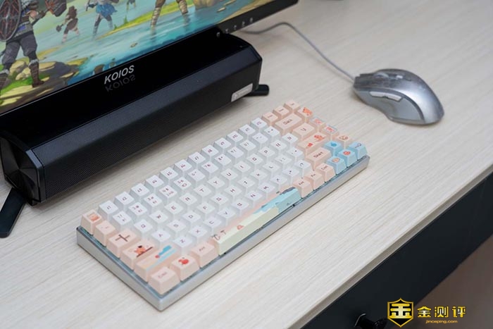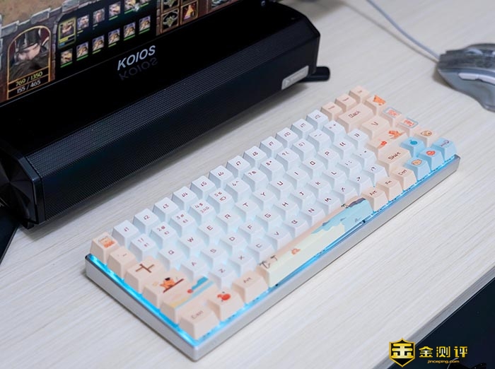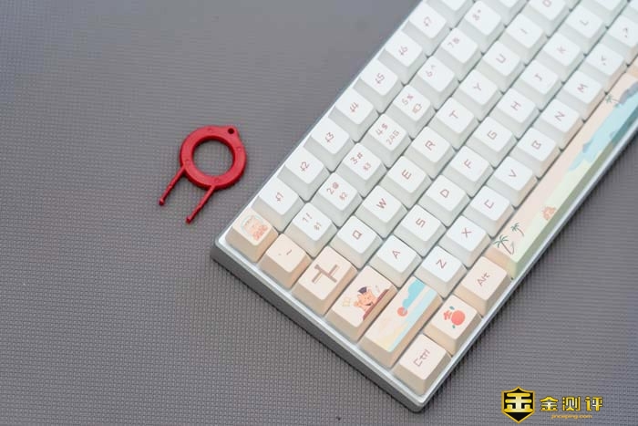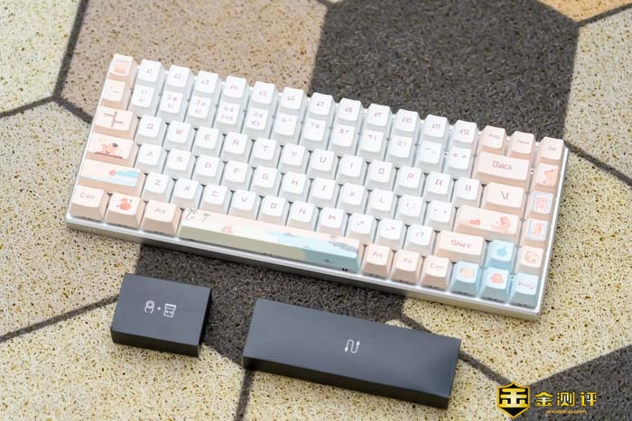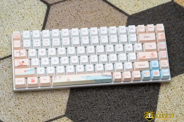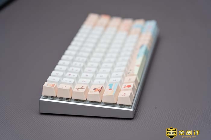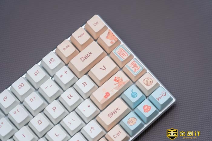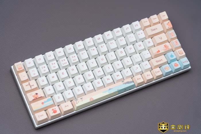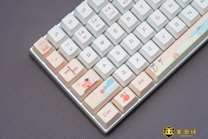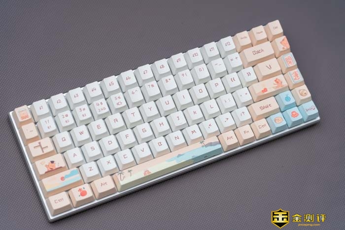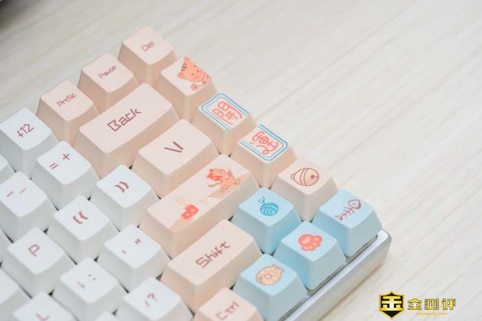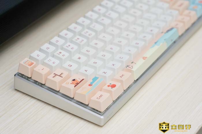 键盘主要有白和粉的拼色。这两种双拼色在一起非常的湿润,慵懒。可以看到键帽上不仅有常见的字符,还有一些图案在上面。如小萌虎,沙滩和日出等等。