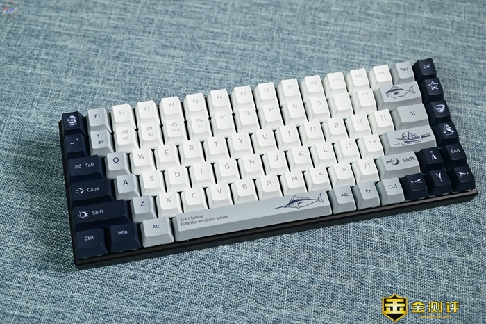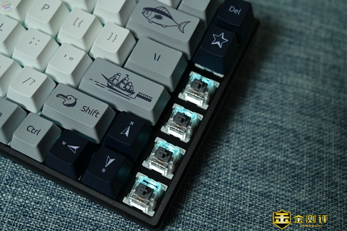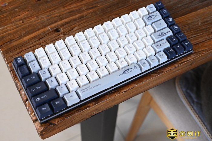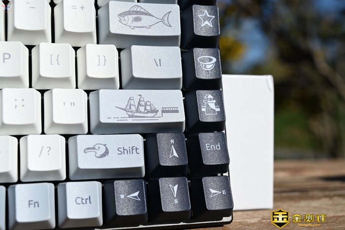 在按键字符和图案的设计上,雷柏MT510PRO在左右两侧以及空格键位置,加入了非常有趣的主题插画,比如我这套航海日记主题的键帽,上面就有灯塔、帆船、罗盘、大鱼等图案,看起来十分活泼。因为键盘右侧按键基本都是插画图案了,所以包装里面还准备了一张键位图,方便刚上手的玩家参考。