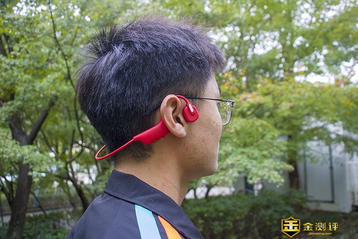 耳机是两个圆形的片,没有塞入耳廓的负担,只要夹在耳朵旁边即可,设计带有耳挂,保证牢固性。
