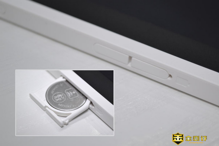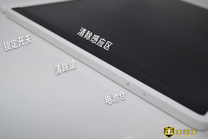 来看看小黑板的控制部分,主要是四个部分。清除感应区,使用笔挂或笔杆磁石靠近时,清除字迹;锁定开关,开启后可以防止误删涂写内容;清除键,采用微动开关的实体按键;电池仓,内置的纽扣电池,一年可以提供36500次的清除功能。