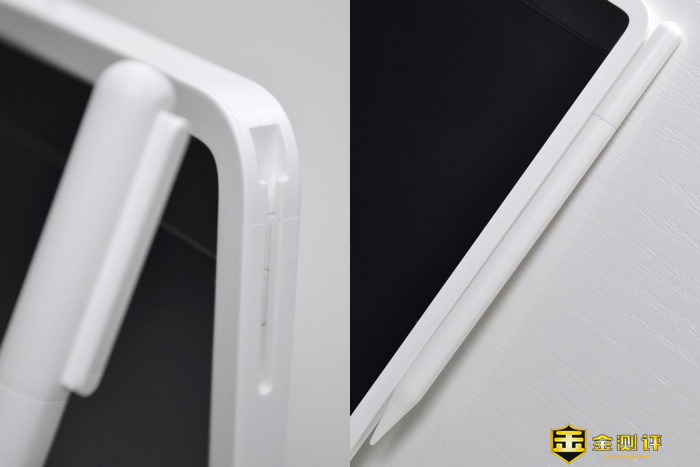 小黑板预留了笔挂凹槽,加上笔杆暗藏的磁铁可以更好的收纳手写笔。小孩子丢三落四的,算是顶号的设计,让孩子养成良好的使用习惯随用随取。