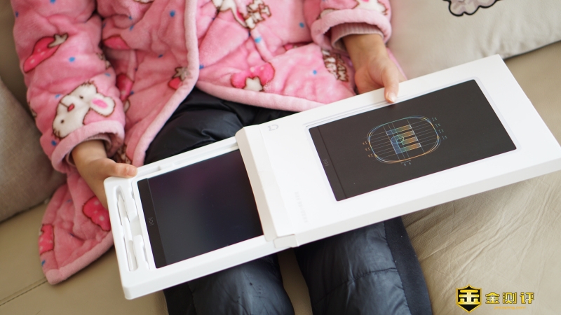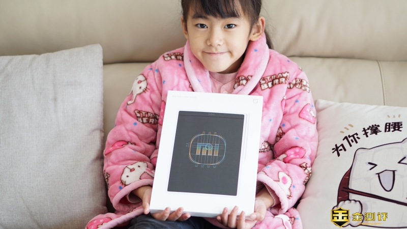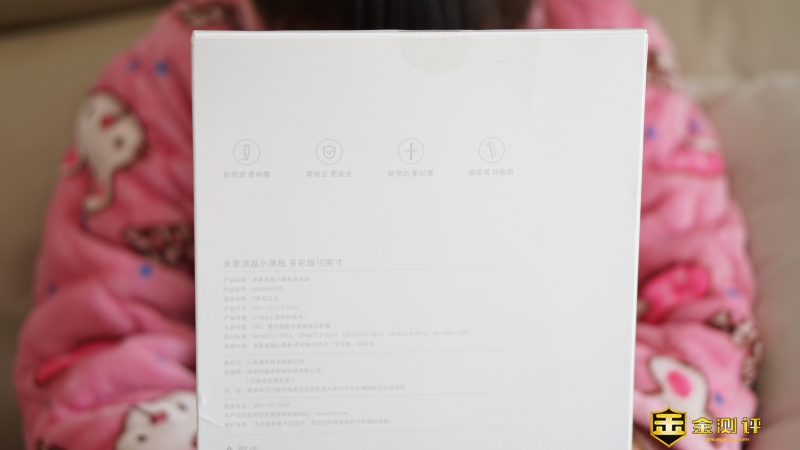 包装相当简约,正面印制了整个小黑板的全貌,中间用彩色线条勾勒出MI字图案,预示了产品的出身,同时也透露出这是一款可以显示多种色彩的液晶小黑板。