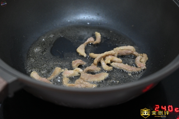 因为聚热效果很强,所以平时煎炒的时候,食材很快就会熟了,比如我在炒菜的时候,丢进锅里的小肉条很快就变白了。