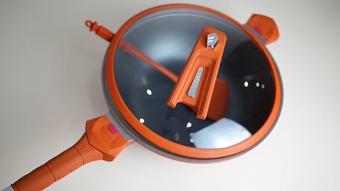 帝伯朗Century城际八合一浮雕多用锅锅盖把手除了前文提到过的可以释放锅内气压外,还能够立在平面,这样的话就不会占用太多的厨房桌面空间,相信我,厨房的操作空间实属寸土寸金。