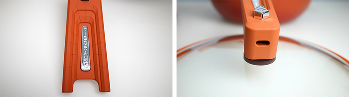 看似简单的一个把手,实际通过这个把手可以实现“微压”的效果,锅盖部分是有橡胶圈与锅体吸附的,严密到需要使劲儿才能打开,而锅盖部分没有预留蒸汽孔,而是设计了一个人工压按的按钮,在需要“微压”时不按,在日常使用需要释放蒸汽的时候按一下这个开关即可。通过这种物理的设计,帝伯朗Century城际八合一浮雕多用锅可以提供17Kpa的微压,在制作炖菜的时候更加容易收汁,美味更快捷。