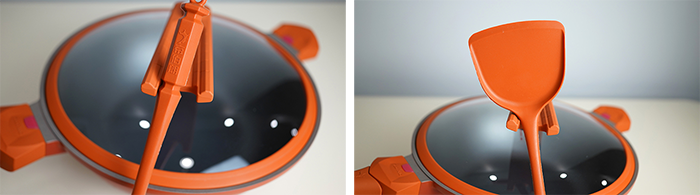 帝伯朗Century城际八合一浮雕多用锅还随锅赠送了一个锅铲,这款锅具属于“不粘锅”的范畴,所以肯定不能直接用传统的金属锅铲,这样会破坏不沾涂层,而搭配的这个锅铲与锅具的颜色是一致的,用起来也比较舒服。要是能有勺子等一系列的用具就更完美了。如果仔细看可能会觉得这个锅铲的造型似曾相识,其实是有点像路灯啦。